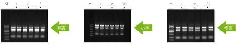 以上參考圖分別取50mg燕麥葉片,20mg小鼠肝臟和1ml細(xì)菌DH5α菌液各數(shù)份,組織進(jìn)行液氮研磨處理,菌液離心收集細(xì)胞后,分別加入1ml Zomanbio RNApure 和 T、I公司相應(yīng)產(chǎn)品,按各自說(shuō)明書(shū)進(jìn)行RNA提取。洗脫體積分別為80μl、100μl、60μl。RNA電泳上樣量分別為5μl,1%瓊脂糖凝膠電泳。