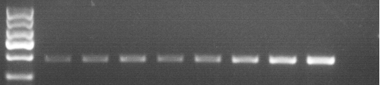 注:收集一定數(shù)量的293T細(xì)胞,使用本試劑盒提取總RNA, 10μl洗脫,取3μl進(jìn)行RT-PCR實(shí)驗(yàn)。上圖即為RT-PCR電泳結(jié)果,可以看到,細(xì)胞數(shù)量在1*102-8*102范圍內(nèi),均有PCR條帶,且條帶亮度成梯度增加。