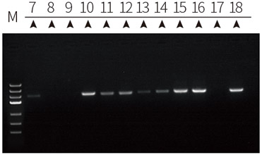 | M:MakerⅢ(ZOMANBIO) 7-8:T公司酶直接鑒定結(jié)果 9:T公司酶陰性對照 10:T公司酶陽性對照 11-12:B公司鑒定試劑盒鑒定結(jié)果 13:B公司鑒定試劑盒陰性對照 14:B公司鑒定試劑盒陽性對照 15-16:本公司ZC221A鑒定結(jié)果 17:本公司ZC221A陰性對照 18:本公司ZC221A陽性對照 |