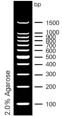 本產(chǎn)品是由11條線性雙鏈DNA組成,適用于瓊脂糖凝膠電泳中DNA條帶的分析。本產(chǎn)品為即用型產(chǎn)品,已含有1×loading buffer,可根據(jù)實驗需要,直接取2-5μl電泳,使用方便,電泳圖像清晰。本產(chǎn)品中11條帶為100,200,300,400,500,600,700,800,900,1000,1500bp。其中500bp條帶約為100ng/5μl,顯示加亮帶,其余條帶濃度約為50ng/5μl。
