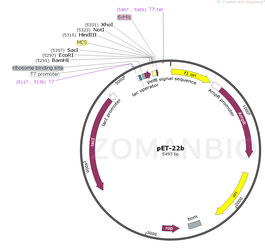 pET-22b質(zhì)粒是一種原核表達載體,N端含有一個pelB前導(dǎo)肽、C-端的His標簽。該質(zhì)粒含有多個常用的酶切位點,便于不同基因克隆。表達由宿主細胞提供的T7 RNA聚合酶誘導(dǎo),目的基因被克隆到質(zhì)粒載體上,受噬菌體強轉(zhuǎn)錄及翻譯信號控制。T7 RNA聚合酶啟動的克隆和表達區(qū)域在質(zhì)粒圖譜中也被標注了出來。質(zhì)粒的F1復(fù)制子是被定向的,所以在T7噬菌體聚合酶的作用下,包含有蛋白編碼序列的病毒 粒子能夠產(chǎn)生,并啟動蛋白表達,同時蛋白表達將被T7終止子序列的作用下終止蛋白翻譯。
