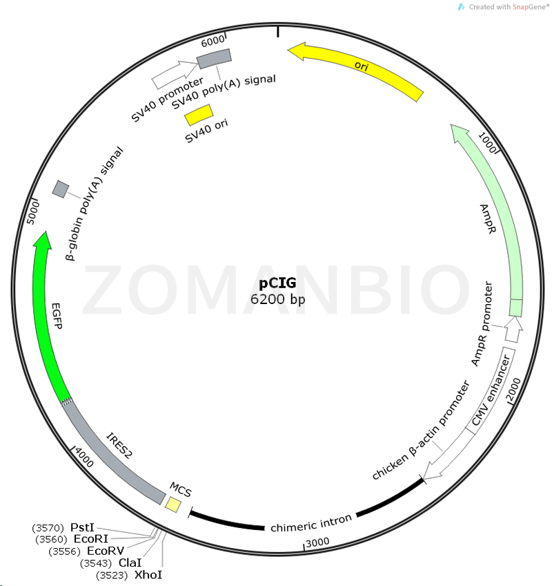 pCIG質(zhì)粒是一個哺乳細(xì)胞過表達(dá)載體,CAG啟動子驅(qū)動目的基因的表達(dá)。 質(zhì)粒只保證關(guān)鍵序列正確,不保證表達(dá)效果。