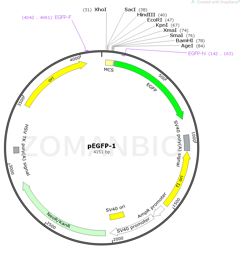 pEGFP-1編碼野生型GFP(1-3)的紅移型變體,其已經(jīng)針對更明亮的熒光和哺乳動物細胞中更高的表達進行了優(yōu)化。(激發(fā)最大值= 488nm;發(fā)射最大值= 507nm)pEGFP-1骨架還提供了用于在大腸桿菌中繁殖的pUC起始點和用于單鏈DNA生產(chǎn)的f1起源。