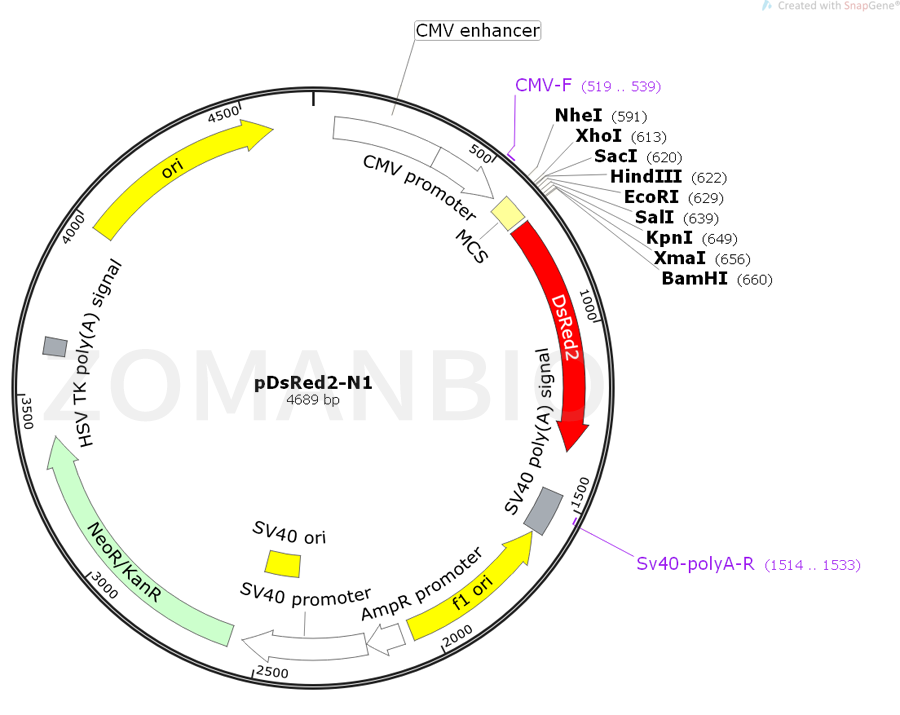 質(zhì)粒序列請(qǐng)下載:ZK433pDsRed2-N1哺乳熒光質(zhì)粒.txt