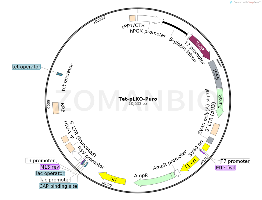 Tet-pLKO-puro tet vector plasmídeo, tamanho 10633 prokaryotic resistentes ampicilina, é cópia de Baixa cultura, transportadora, 37, 2 lb.