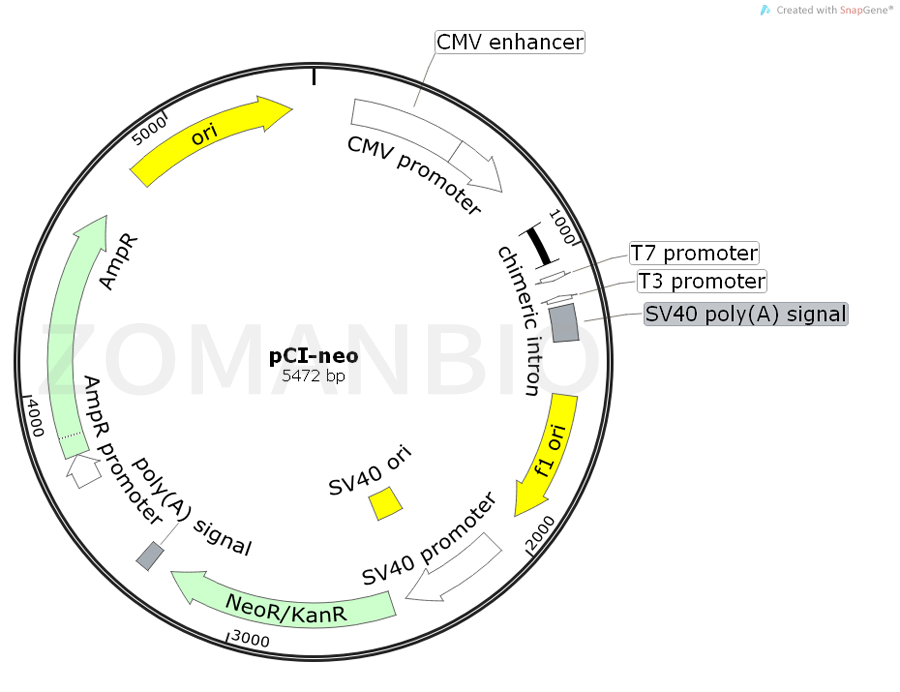 pCI-neo Mammalian Expression Vector(pCI-neo 哺乳動物表達載體) 攜帶有人類巨細胞病毒(CMV) 的即刻早期增強子/ 啟動子區(qū)域,來促進哺乳動物細胞中插入克隆DNA 的組成型表達。此載體也帶有新霉素磷酸轉移酶基因, 一種哺乳動物細胞的選擇性標志物。通過G-418 抗性篩選轉染細胞,pCI-neo 載體能夠用于瞬時或穩(wěn)定表達。